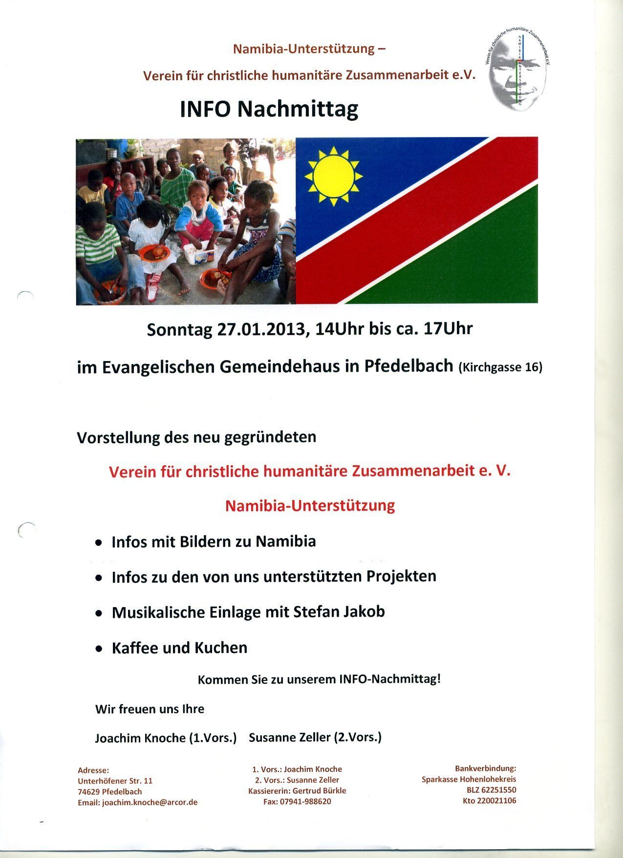 Etwa 50 Interessierte kamen zu einem Info-Nachmittag des neugegründeten Namibia-Unterstützungsvereins ins Evangelische Gemeindehaus nach Pfedelbach. In einer Bilderschau wurde zuerst das Land vorgestellt mit seinen beeindruckenden Landschaften, der vielfältigen Tierwelt, den einzelnen Volksstämmen und der für uns Deutsche nicht immer ruhmreichen Geschichte (Herero-Aufstand). Danach sang Stefan Jakob drei einfühlsame Lieder, deren Texte von der Hoffnung auf Gerechtigkeit und Dankbarkeit handelten. Bei Kaffee und Kuchen in gemütlicher Atmosphäre kamen interessante Gespräche zustande. Anschließend berichteten Joachim Knoche (der Vorsitzende des Vereins) und seine Frau Margret von ihren eigenen Erfahrungen, die sie in den Jahren ihres Aufenthaltes von 1988 bis 1996 in Namibia machten. Unterstützung ist notwendig, denn es fehlt an fast allem: an Nahrung. Kleidung, Kinderbetreuung, schulischer und medizinischer Ausstattung.
