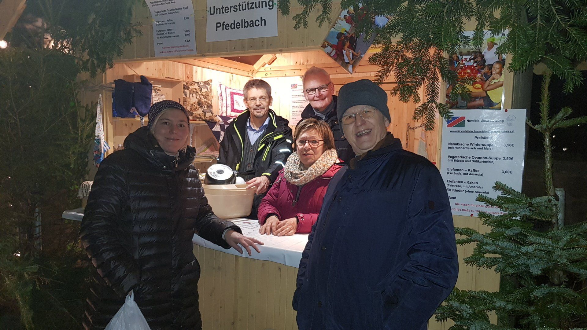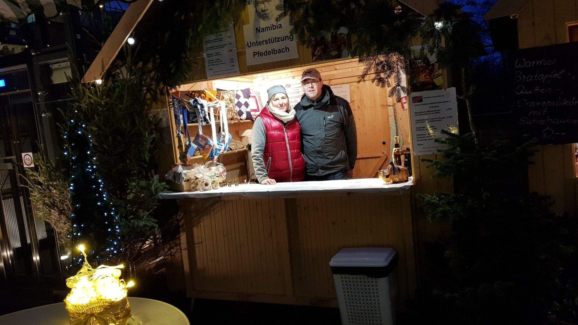 On the third Sunday of Advent, from Friday, December 13th, to Sunday, December 15th, the Namibia Support Association (Namibia-Unterstützungsverein e.V.) had a Christmas stall in the castle courtyard at the Öhringen Christmas market. In addition to small African and German Christmas gifts, they offered Namibian winter soup (with corn and chicken) and vegetarian Ovambo soup (with pumpkin and sweet potatoes). They also sold fair-trade Elephant Cocoa and Elephant Coffee, each with or without Amarula liqueur, and homemade cookies (Brödle). Unfortunately, it rained on two days.