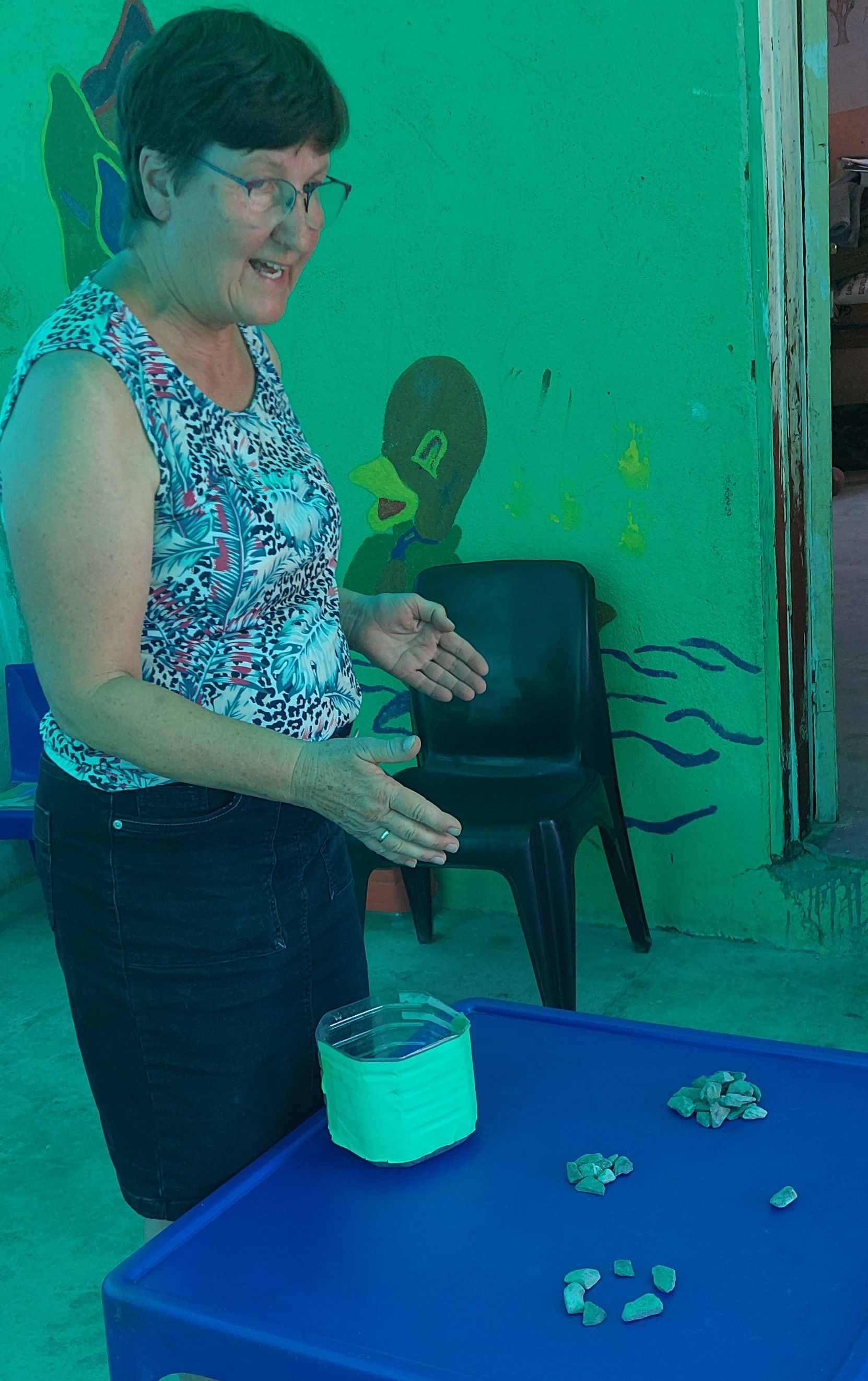 Zwei Tage später waren wir zu Besuch in unserer Suppenküche für die Kindergarten- und Grundschulkinder. Dabei sah ich Rosmary, wie sie ohne meine Aufforderung mit den kleinen Kindergartenkindern den Farben-Zahlen-Pappteller ausprobierte, den sie bei dem Elternworkshop selbst hergestellt hatte. Ein kleines Zeichen mit den ersten Früchten des Elter-Workshops mit den Kindergarteneltern.