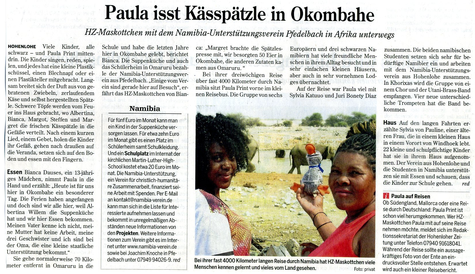 Paula-Print, a fabric newspaper duck, was in Namibia as an independent reporter for the Hohenloher Zeitung of the Heilbronner Stimme and reports on the activities of the association (on 29.9.2015)